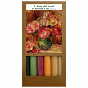 A set of six dinner candles inspired by the soft, romantic colours of Renoir’s painting Vase with Roses. Gentle pinks, creams, warm reds, and soft peach tones capture the delicate beauty of roses in bloom.